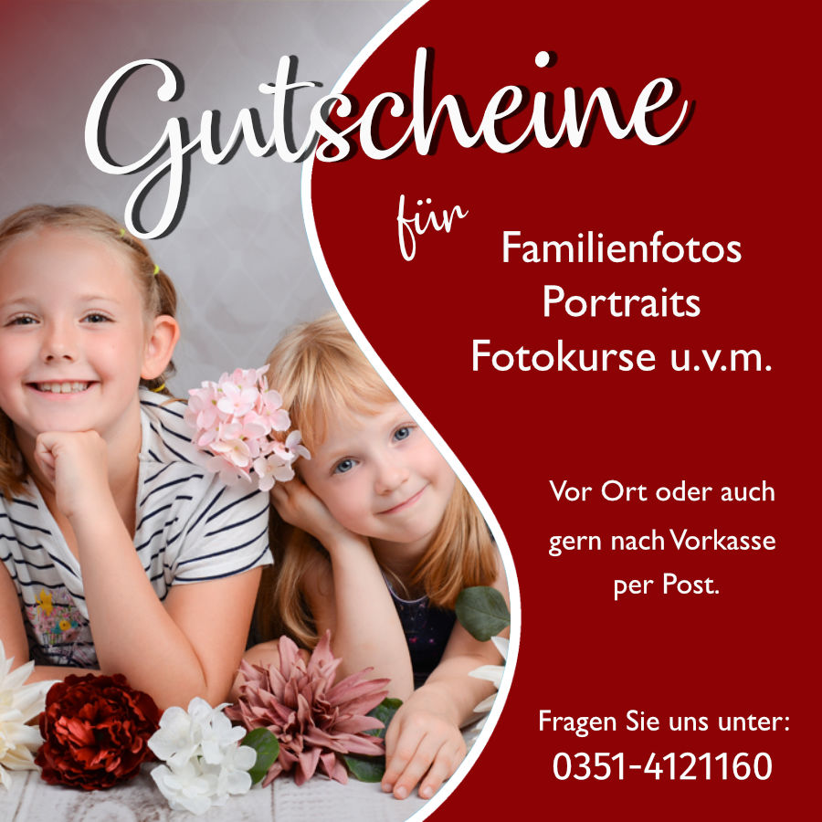 Immer eine gute Idee: Gutscheine für Familienfotos, Portraits, Fotokurse und vielem mehr erhalten Sie bei uns vor Ort oder senden sie Ihnen natürlich auch gern nach Vorkasse per Post zu.